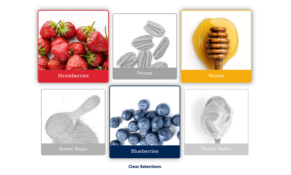 This grouping of the six most popular flavors gathered from market research is a breeze to use. Upon interacting with the section the user will notice a subtle and pleasant hover state and a more prominent active and clicked states. There is even a convenient 'clear selections' button to start over if the excitement proved too much.