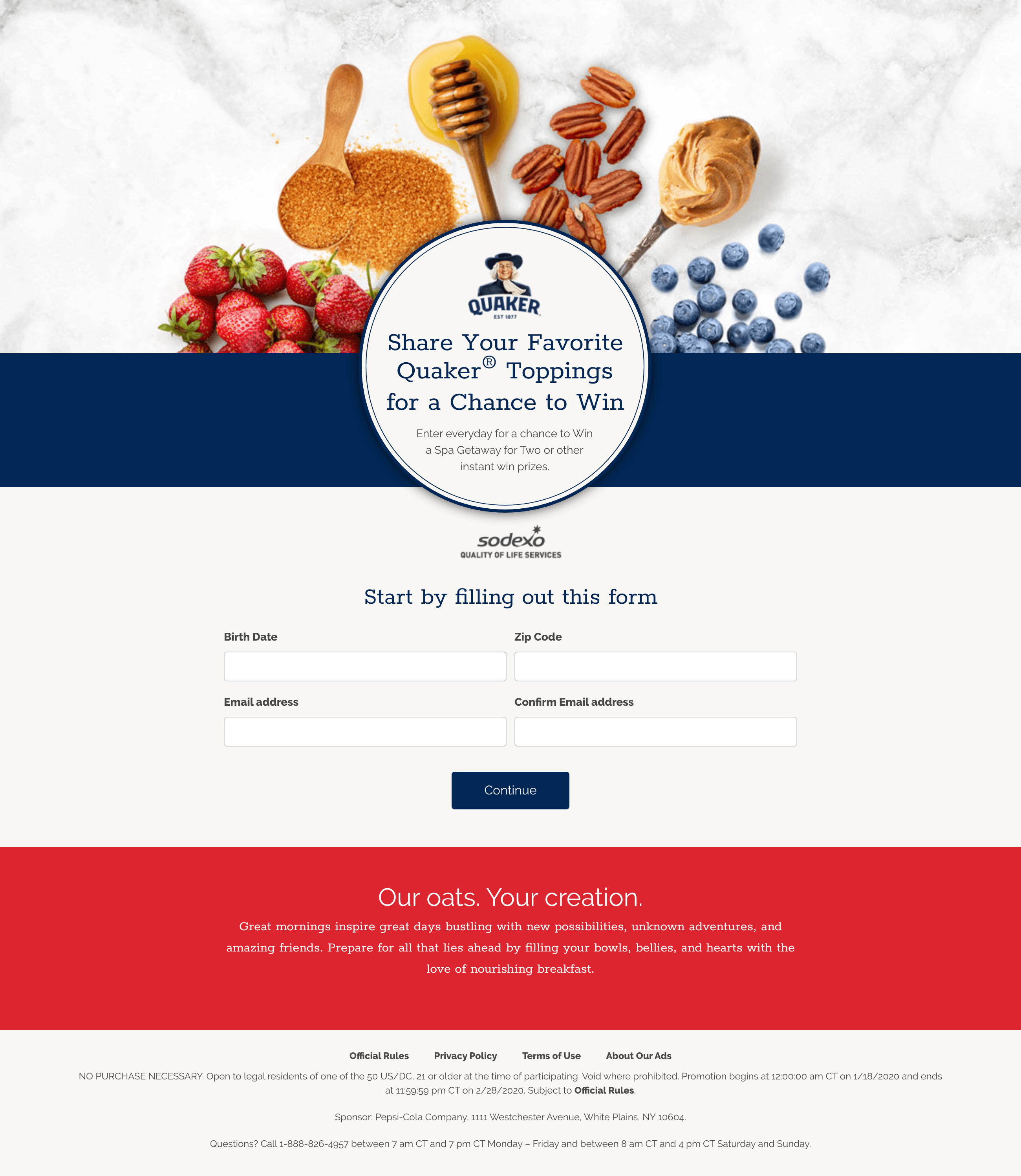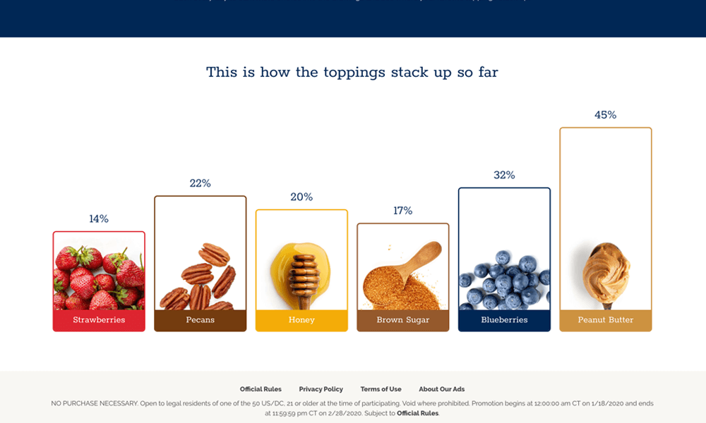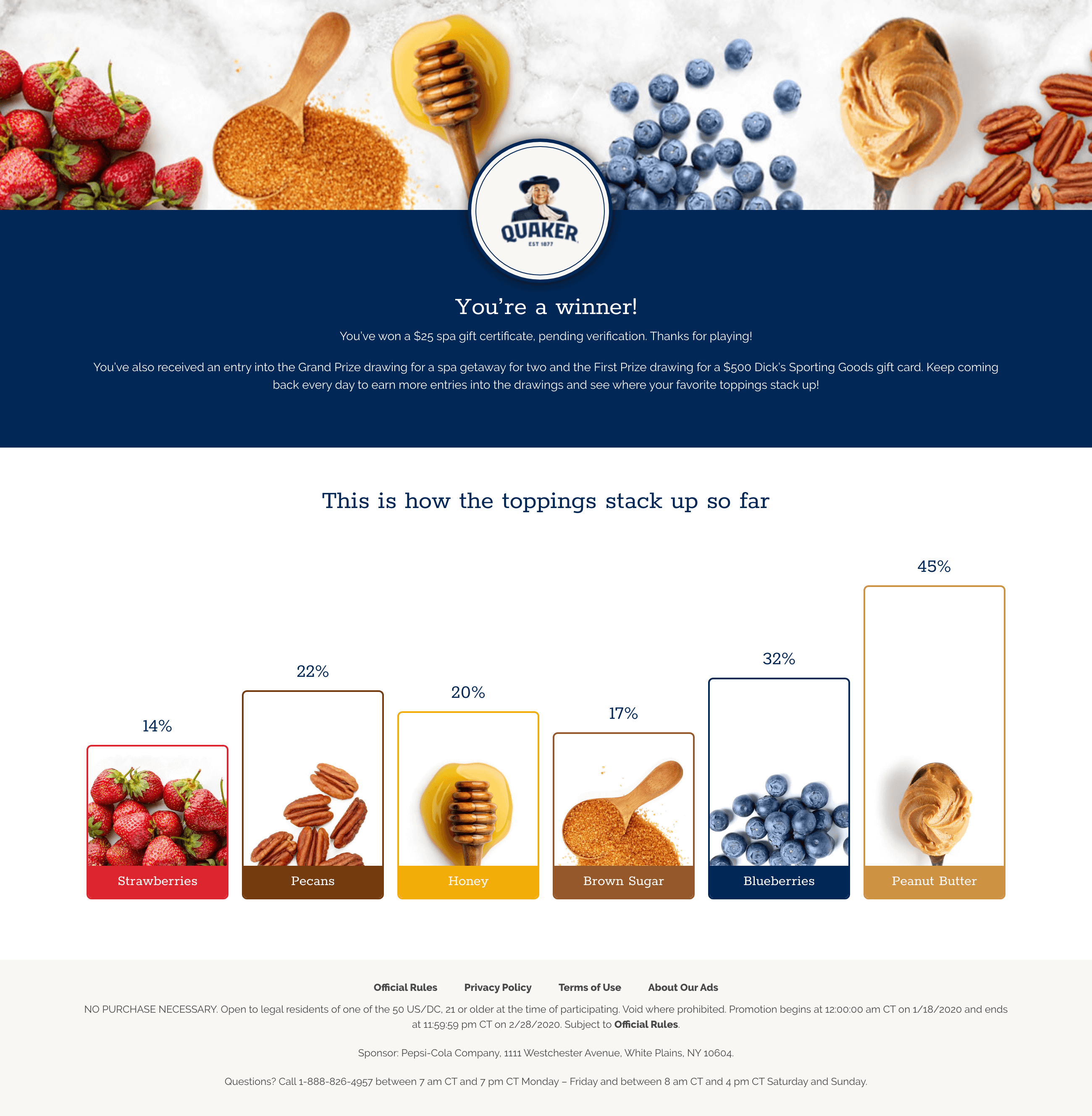 Oatmeal lovers rejoice! Users can cast their vote for their favorite oatmeal toppings for a chance to instantly win spa gift cards or the Grand Prize, a Spa Getaway. They can also see how their favorites stand up nation wide. Users can only vote once during the sweepstakes but can be entered once a day for the Grand Prize. Users were encouraged to come back daily to see how their favorite toppings were stacking up.
